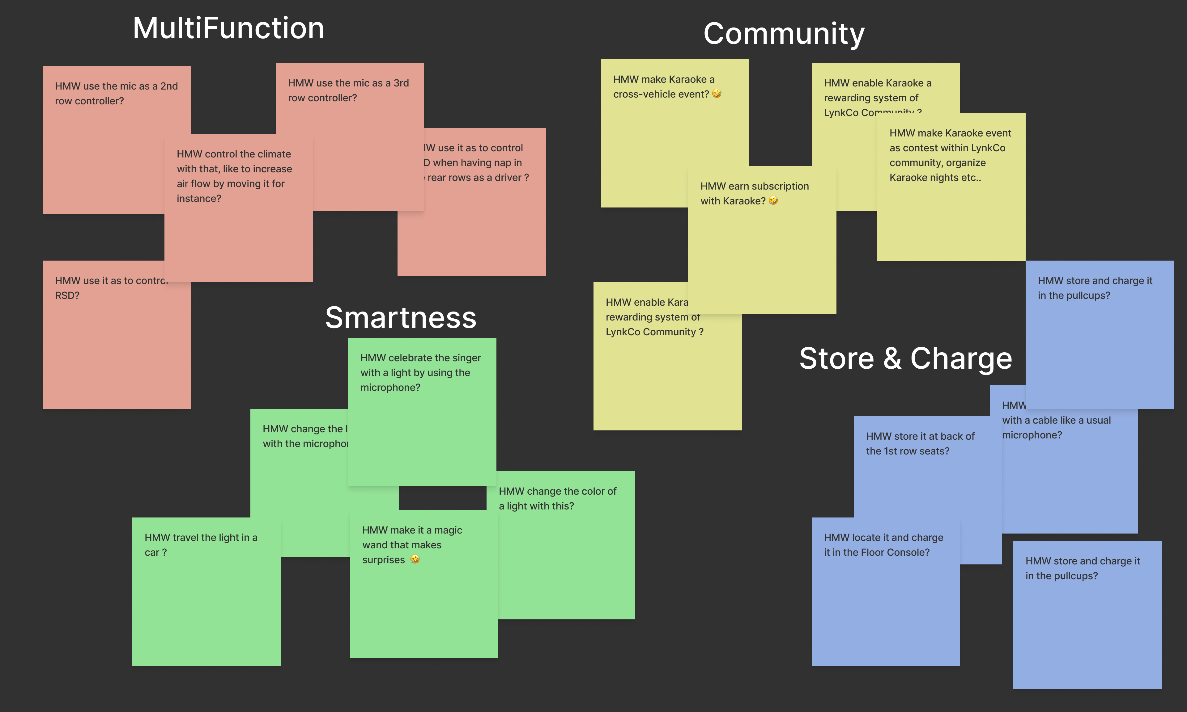I facilitated cross-functional workshops with HMI department leads to ideate on "The Future of In-Car Joy." Through a collaborative voting process, the In-Car Karaoke Experience emerged as the top priority, specifically targeting the high demand for family entertainment in the Chinese market.